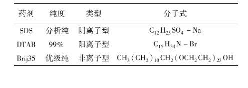 選用3種表面活性劑開展浮選精煤脫水過濾試驗。3種表面活性劑分別為十二烷基硫酸鈉(SDS)、十二烷基三甲基溴化銨(DTAB)、月桂醇聚氧乙烯醚(Brij35)。3種藥劑的疏水端均為十二烷基,親水端分別為硫酸根、銨根以及聚氧乙烯醚,3種藥劑的物理化學(xué)性質(zhì)見表3。