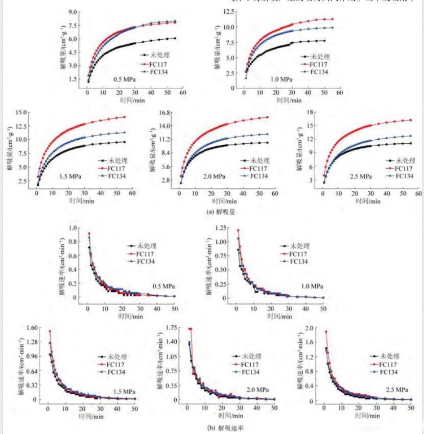 4)對經(jīng)過FC117和FC134處理后的干燥/含水煤樣進行解吸量和解吸速率的測定,兩種表面活性劑處理后煤樣的解吸效果均有顯著的效果。在氣潤濕反轉(zhuǎn)劑處理后的煤樣吸附量小于未處理的,而解吸量和解吸速率大于未處理的,則表明氣潤濕反轉(zhuǎn)劑處理后的煤樣可以消除水鎖效應(yīng),增加解吸率,提高解吸效果。