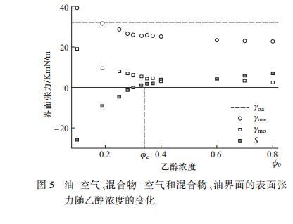 圖5油~空氣、混合物~空氣和混合物、油界面的表面張力隨乙醇濃度的變化