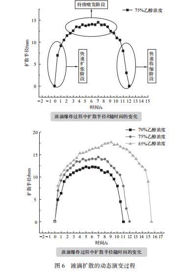 實(shí)驗(yàn)1探究液滴擴(kuò)散的動態(tài)演變過程就是將前文用文字性描述的液滴擴(kuò)散現(xiàn)象定量處理,用數(shù)據(jù)清晰的看出液滴爆炸過程中擴(kuò)散半徑隨時(shí)間的變化,如圖6所示,可以從折線圖中直觀看出液滴爆炸的三個過程。