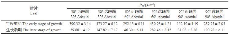 以上結果表明,蘋果葉片生長前期近軸面的Rm值高于生長后期,且在同一生長期,蘋果葉片遠軸面的Rm值遠高于近軸面。此外,蘋果葉片的Rm值隨葉傾角的增大而減小。