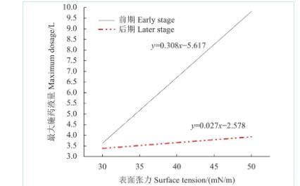 圖8為估算出的蘋果樹葉片分別在生長前期和后期施藥的最大藥液量與藥液表面張力的關系。從中可以看出,在試驗果園中,在蘋果樹生長前期施藥的最大施用量受藥液表面張力的影響大于在生長后期施藥。