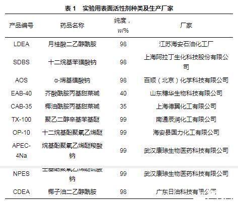 表1實驗用表面活性劑種類及生產(chǎn)廠家