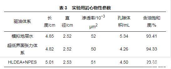 通過巖心動態(tài)驅(qū)替實驗評價體系提高采收率的能力,實驗裝置見圖1。采用不間斷驅(qū)油的方式,以0.3 mL/min的注入流量驅(qū)油。分別考查模擬地層水、HLDEA+NPES體系和超低界面張力體系的驅(qū)油性能。實驗用巖心物性參數(shù)見表3。實驗的具體步驟如下。