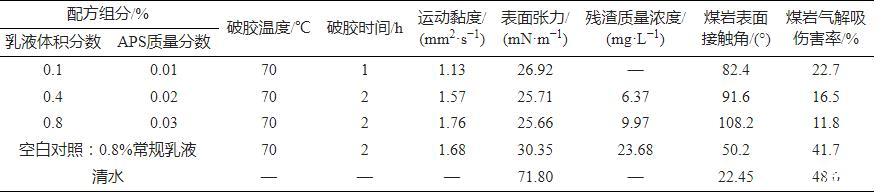 創造性地向聚合反應體系中引入無機鹽刺激響應材料,設計開關型反相乳液聚合技術[10],將丙烯酸鈉/丙烯酰胺、陽離子單體、弱極性單體、微梳型控制單體等進行共聚,復配煤巖氣促解吸劑后制備成開關型乳液減阻劑,遇配液水中無機鹽刺激響應,破乳轉相實現快速溶解。契合煤巖氣極限體積壓裂設計思路,設計優化高、中、低黏壓裂液配方,構建深層煤巖氣高效能變黏壓裂液,依靠微梳型結構以及特殊功能基團間的共價鍵相互作用,形成可逆的空間結構,具備剪切稀釋性和低黏高彈性,保證降阻性能的同時完成高強度攜砂;壓裂液破膠后可對煤巖表面潤濕性改善,增大接觸角,顯著降低毛管力,減小煤巖自吸液量,促進煤巖氣解吸。