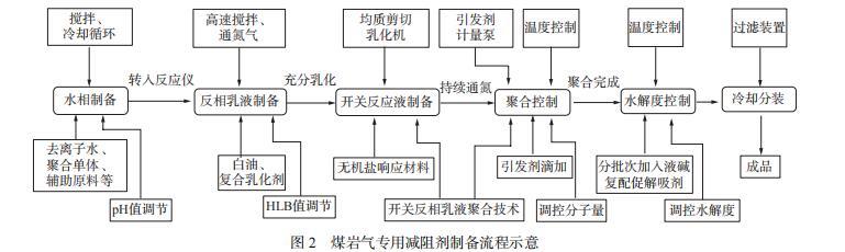 通過對水相制備—反相乳液制備—開關反應液制備—聚合控制—水解度控制—后處理等—系列過程中pH值、HLB值、引發劑、溫度等的控制,形成煤巖氣專用減阻劑制備流程,如圖2所示。