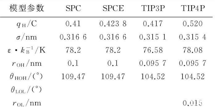 水分子模型很多,如SPC、SPCE、TPI3P和TPI4P等,其結(jié)構(gòu)示意圖和模型參數(shù)分別見圖3和表1。水分子的勢能函數(shù)如式(1)所示。
