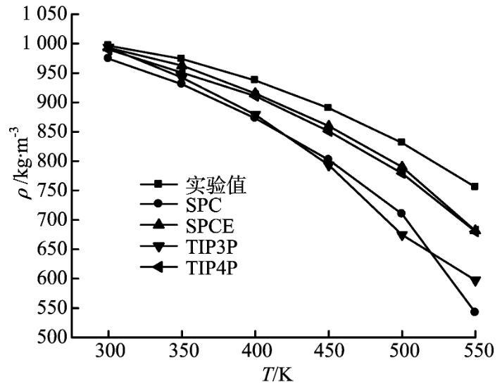 圖5不同水分子模型的液相主體密度與實(shí)驗(yàn)值比較