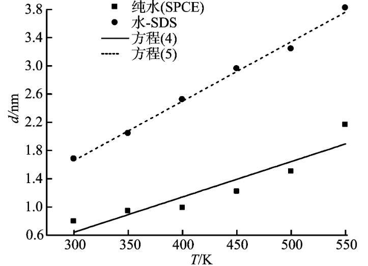 界面厚度取從水相體相密度的90%到表面活性劑體相密度的90%。模擬水分子數(shù)N1=3 000,十二烷基硫酸鈉數(shù)N2=20,在溫度T=300、350、400、450、500和550 K時(shí),模擬得到界面厚度,將其與純水體系的界面厚度對(duì)比,如圖9所示。從圖9可以看出,水—表面活性劑體系的界面厚度隨溫度的增加而增加,而且和純水體系的界面厚度對(duì)比可知,水—表面活性劑體系的氣—液界面厚度明顯增大。同時(shí),對(duì)純水體系和水—表面活性劑體系的界面厚度模擬值進(jìn)行擬合可分別得到式(4)和(5)。