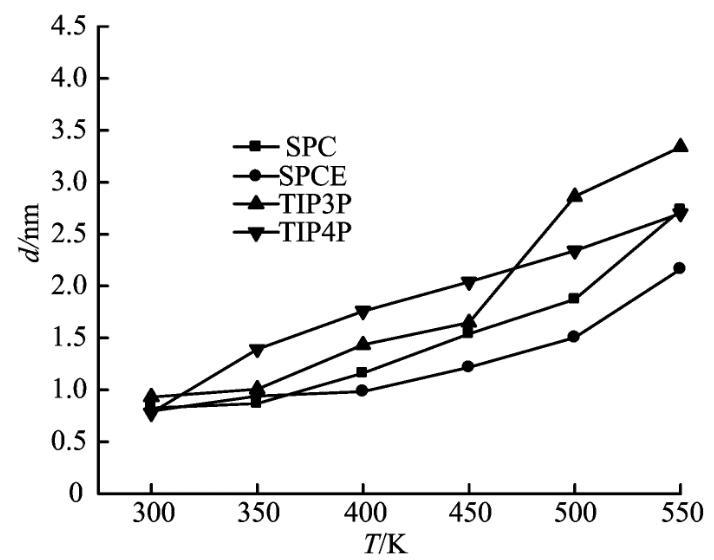 根據(jù)“10-90”法則進(jìn)行計(jì)算,分別求得SPC、SPCE、TIP3P和TIP4P在300~550 K的界面厚度如圖6所示。