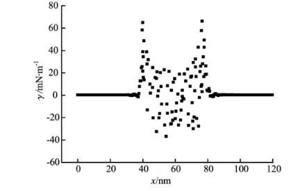 模擬水分子數(shù)N1=3 000,十二烷基硫酸鈉數(shù)N2=20,溫度T=300 K,水—表面活性劑體系的局部界面張力見圖10。由圖10可知,從汽相主體向液相過渡過程中,界面張力值逐漸增加,在氣—液界面區(qū)達(dá)到峰值;在液相主體又在零值附近波動(dòng)。