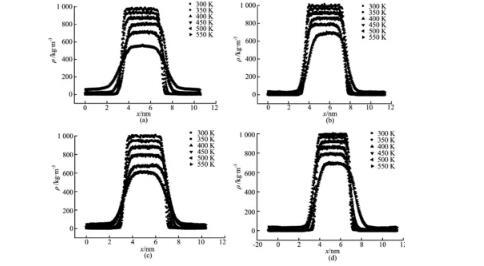 模擬分子數(shù)N=1 327,四種水分子模型分別在溫度T=300、350、400、450、500和550 K時(shí),模擬得到的密度分布如圖4所示。從圖4可以看出,曲線可以劃分為三個(gè)部分,分別為汽相主體、液相主體以及氣—液界面層。隨著溫度的增加,液相主體密度逐漸降低,氣相主體密度逐漸升高,氣—液界面區(qū)域逐漸變寬。