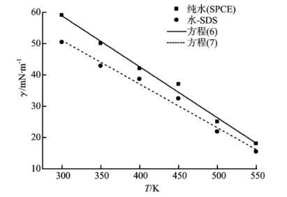 從圖11可以看出,水—表面活性劑體系的界面張力隨溫度的升高而降低,而且加入十二烷基硫酸鈉后水的界面張力明顯降低。對(duì)純水體系和水—表面活性劑體系的界面張力模擬值進(jìn)行擬合可分別得到式(6)和(7)。