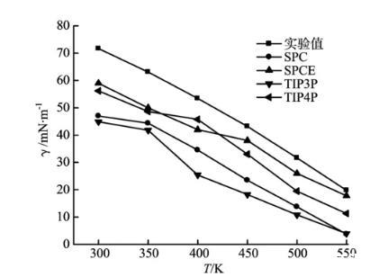 圖7不同水分子模型的界面張力與實(shí)驗(yàn)值比較