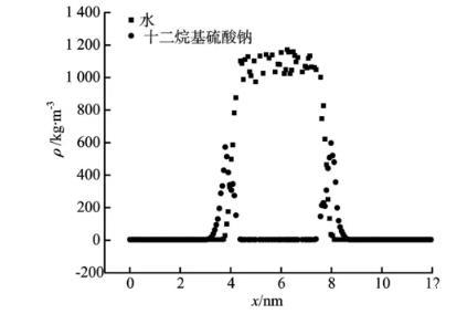 向純水中加入十二烷基硫酸鈉表面活性劑,水分子3 000個(gè),十二烷基硫酸鈉20個(gè),模擬得到300 K下水—表面活性劑體系的密度分布,如圖8所示。由圖8可見,對(duì)于只有水的體系來說,其密度變化基本是符合由汽相到液相逐漸增加的趨勢,而對(duì)于加入的表面活性劑十二烷基硫酸鈉的體系來說,其密度的變化情況與只有水的體系有明顯的不同。從圖8可以看出,在氣—液兩相的過渡區(qū)域,加表面活性劑的體系密度出現(xiàn)明顯的增長。