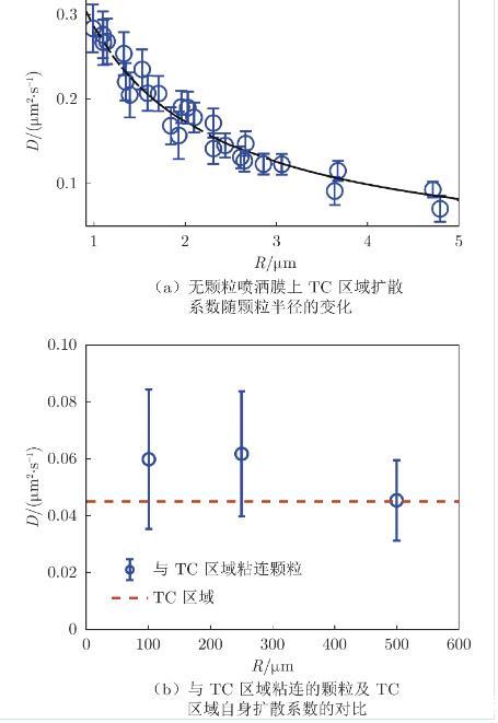 均為常數(shù),取自文獻。肺表面活性劑單層膜厚度為1 nm,由此可得膜的體黏度為0.77 Pa·s,是純水黏度的770倍。圖9(b)將與TC區(qū)域粘連的顆粒的擴散系數(shù)(以圓形表示)與單獨TC區(qū)域的擴散系數(shù)(以虛線表示)進行了對比,后者選取3.5μm為平均TC區(qū)域直徑(參照圖2照片),由HPW模型代入計算得出。可以看出,在實驗統(tǒng)計誤差范圍內(nèi),二者近似相等,表明顆粒與TC區(qū)域形成的整體受力主要來自于TC區(qū)域。TC區(qū)域直徑遠大于顆粒直徑,膜內(nèi)黏滯阻力更大;此外,膜的體黏度遠大于水相,因此水相對顆粒浸沒部分施加的黏滯阻力可忽略不計。