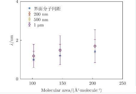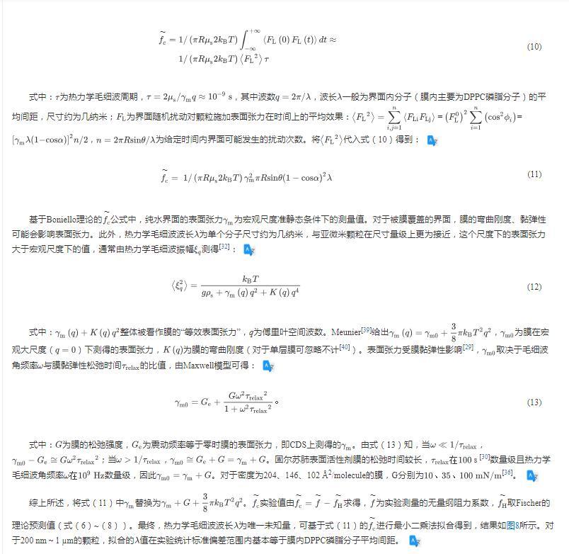 公式中,純水界面的表面張力為宏觀尺度準靜態(tài)條件下的測量值。對于被膜覆蓋的界面,膜的彎曲剛度、黏彈性可能會影響表面張力。此外,熱力學毛細波波長為單個分子尺寸約為幾納米,與亞微米顆粒在尺寸量級上更為接近,這個尺度下的表面張力大于宏觀尺度下的值,通常由熱力學毛細波振幅測得:
