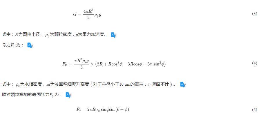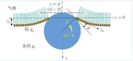 顆粒的水動力學阻力系數(shù)取決于顆粒在水相中的浸沒程度(圖5,以顆粒暴露在空氣中的高度d表示)。顆粒的平衡位置取決于重力、浮力及膜施加的表面張力。重力G為: