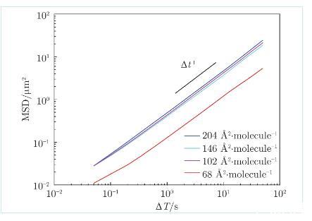 在LE相表面均勻的膜上,均方位移MSD隨時間間隔Δt線性增長(圖4),阻力系數(shù)由愛因斯坦關系