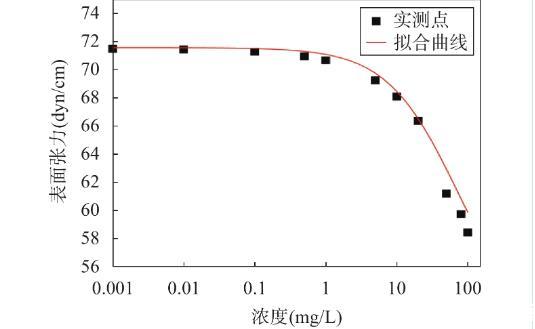 在0.01mol/L氯化鈉溶液中測量所得的6∶2氟調(diào)磺酸表面張力如圖1所示,圖中實心點表示同一濃度下表面張力的實際平均值,曲線是基于Szyszkowaki方程擬合所得。利用該方程擬合的相關(guān)參數(shù)A和B的值分別為12.70和0.075。實驗結(jié)果顯示實測數(shù)據(jù)點與擬合曲線偏移量較小,這證實了Szyszkowaki方程對本實驗體系的表面張力數(shù)據(jù)具有良好的擬合效果。