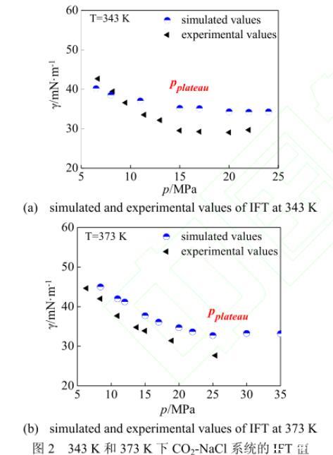 本文分別模擬了343 K和373 K的各壓強下鹽濃度為1.89 mol·L-1的CO2-NaCl系統(tǒng),IFT的計算結(jié)果示于圖2。由圖2可以看出,模擬所得的IFT值與Chalbaud等的實驗數(shù)據(jù)吻合較好。在溫度為343 K時[圖2(a)],IFT值隨著壓強的不斷升高,其減幅逐漸下降,最終在壓力平衡點pplateau=15 MPa之后達到穩(wěn)定值34 mN·m-1。373 K時[圖2(b)]的IFT值變化與343 K時極為相似,IFT值同樣隨著壓強的升高而下降,且下降速度不斷趨于平緩,由于高壓情況下實驗設(shè)備等因素受限制,實驗方法尚未得到25 MPa以上的數(shù)據(jù)點,故在實驗壓強范圍內(nèi)并未觀測到壓力平衡點。而本文應(yīng)用分子模擬的方法,成功模擬了25~35 MPa下的CO2-NaCl系統(tǒng),觀測到壓強在pplateau=25 MPa之后達到穩(wěn)定值33 mN·m-1。