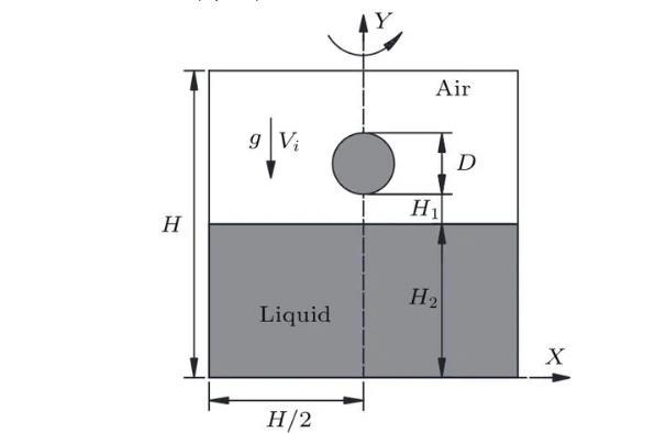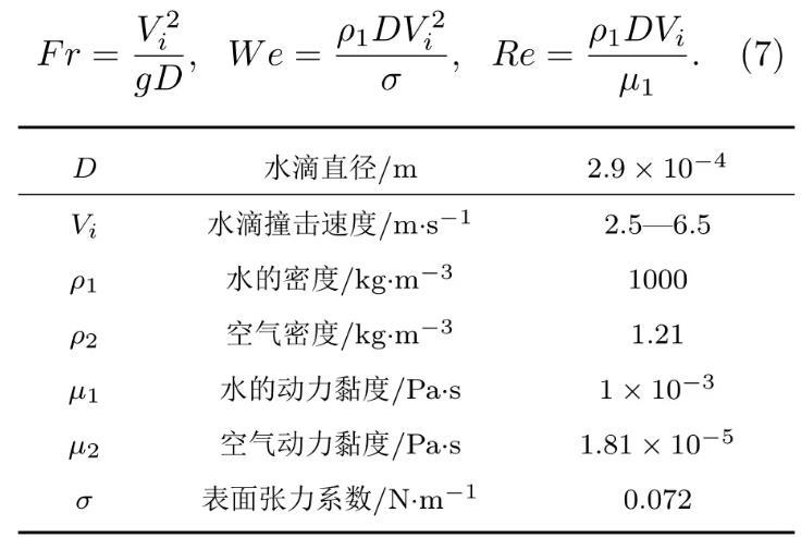 如圖1所示,水滴撞擊深水液池的數(shù)值模擬在軸對稱坐標系中進行,Y軸為計算區(qū)域的對稱軸,D為初始水滴直徑,R=D/2,正方形計算區(qū)域的長度H=20D,水滴距離液面的距離H1=0.1D,液池深度H2=12D以消除底部對液滴撞擊運動的影響,水滴在重力g和撞擊速度Vi的作用下撞擊液池。采用雷諾數(shù)、韋伯數(shù)和弗勞德數(shù)來描述液滴撞擊的運動特征,三者分別表征液體慣性力與黏滯力間的關(guān)系、液體慣性力與表面張力間的關(guān)系以及液體慣性力與重力間的關(guān)系。三個無量綱參數(shù)的表達式如(7)式所示,主要物理參數(shù)如表1所列。