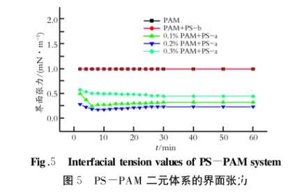 由圖5結果可知,PAM單元體系以及PAMPS-b二元體系,均不能降低原油的界面張力;為了便于在圖形中對比分析,將其界面張力設定為1.0 mN/m而PAM-PS-a二元體系可以將原油的界面張力維持在10-1數量級,數值與PS-a單元體系的界面張力數值相近,因此可以得出:無論是PS單元體系,還是PAM-PS復配體系,PS-b均不能降低原油的界面張力。