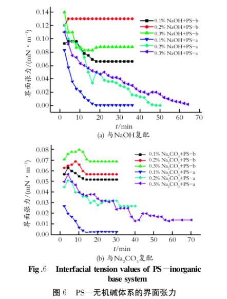 由圖6可以看出:PS-b與NaOH復配,原油的界面張力只可以降到10-2數量級,而PS-a與NaOH復配,可以將原油的界面張力降至10-4數量級;PS-b與Na2CO3復配,原油的界面張力可以降到10-2數量級;PS-a與Na2CO3復配,可以將原油的界面張力降至10-3數量級。綜上分析可以得出:PS-b的界面活性遠遠低于PS-a;PS-a的復配體系可以達到超低界面張力(10-3~10-4mN/m),而PS-b不能。