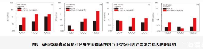 圖8破殼微膠囊聚合物對(duì)延展型表面活性劑與正癸烷間的界面張力穩(wěn)態(tài)值的影響