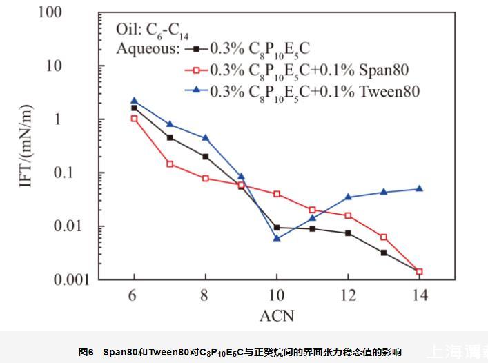 從圖中可以看出,由于Span80是油溶性很強(qiáng)的非離子表面活性劑,其在水中溶解性不好,只能與C8P10E5C分子形成混合膠束。因此,Span80不會(huì)影響C8P10E5C的親水親油平衡,表現(xiàn)為混合體系的nmin值與單獨(dú)C8P10E5C相似。同時(shí),Span80會(huì)分配到油相中,然后從油相一側(cè)向界面吸附。這就造成油相烷烴碳數(shù)較低、界面張力較高時(shí),Span80通過(guò)混合吸附,輕度降低界面張力;而當(dāng)油相烷烴碳數(shù)較高、界面張力較低時(shí),Span80通過(guò)競(jìng)爭(zhēng)吸附,造成界面張力略有升高。但總體而言,油溶性非離子表面活性劑對(duì)界面張力影響不大。