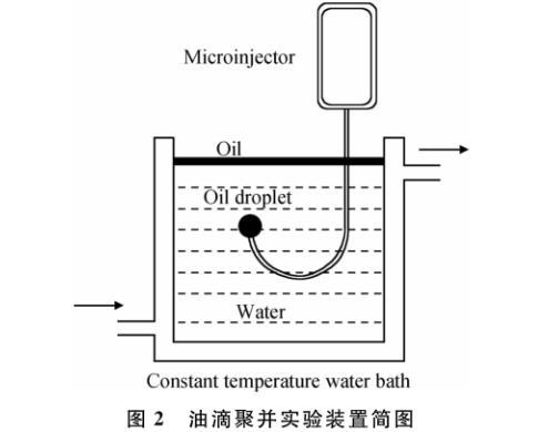 以甲苯與正庚烷(體積比為1/1)為溶劑,將不同原油組分配制成為質量分數1%的溶液作為油相,以模擬殘余HMPAM溶液為水相,利用如圖2所示的實驗裝置:由微量注射泵、彎鉤以及可加熱水槽組成,開展油滴聚并實驗以評價液滴穩定性(或界面穩定性)。利用微量注射泵(可間斷注射)通過彎鉤注射30個30μL的油滴,由于密度差的原因,油滴會在樣品池中上浮;在樣品池上層有一層油相,油滴上浮碰到油相時開始計時,當油滴完全和油相融合時停止計時,這一段時間可以定義為油滴的聚并時間;這期間的過程利用快速攝像錄下,然后分楨計算后,得到所需聚并時間。
