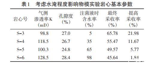 (1)實驗步驟分別將滲透率約為100mD的巖心S-3,S-4,S-5,S-6水驅(qū)至含水率5%,35%,65%,98%,然后注入微生物,評價不同含水期注入功能菌對最終微生物驅(qū)油提高采收率效果的影響,具體實驗步驟如下: