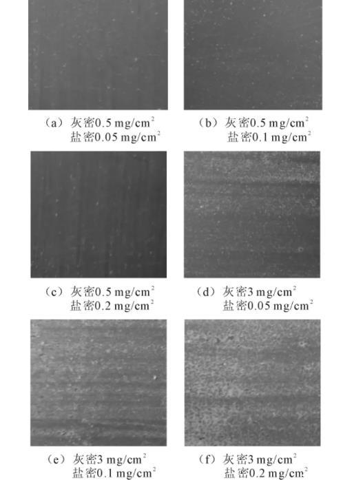 憎水角測(cè)量所用的硅橡膠試片的尺寸為100 mm×100 mm×5 mm。試驗(yàn)中為了保證試片處于相同環(huán)境中,用清水對(duì)試片進(jìn)行清洗,并用酒精擦拭后用無紡布擦干。本試驗(yàn)中的涂污方式采用固體層法中的定量涂刷法,根據(jù)IEC規(guī)程中的污層分級(jí)設(shè)置,選用灰密為0.5、3mg/cm2,鹽密值選用0.05、0.1、0.2 mg/cm2,分別代表污穢程度為“中、重、非常重”的污穢等級(jí)。涂污之前先進(jìn)行打灰處理,再將污液均勻涂抹在試片上。將涂污后的試片和潔凈試片放入相同環(huán)境中,如圖2所示。