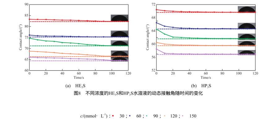 動態(tài)接觸角可以反映隨時間的變化,表面活性劑分子在氣液固界面的吸附平衡。圖8為不同濃度的HE3S和HP3S水溶液在石蠟膜上的接觸角隨時間的變化曲線。由圖8可知,隨溶液濃度的增加,接觸角可以更快降低至平衡值,即表示其鋪展性能與水溶液濃度呈正相關。由圖8可見,當溶液濃度為150 mmol/L時,HE3S與HP3S的水溶液液滴在石蠟膜上可以短時間內快速鋪展,其最低接觸角分別達到64.5°和55.9°。潤濕行為可以分為短時過程和長時過程,短時過程為由氣液界面的表面張力梯度導致的快速潤濕,長時過程為表面活性劑分子從體相擴散至新界面而導致的慢速潤濕。Ruckenstein認為在疏水面上會形成類似于雙分子層結構的膜,該膜中第一層的疏水鏈吸附在固體表面,而親水基與第二層的親水基相接,第二層的疏水鏈朝向空氣。這種結構有利于表面活性劑分子同時吸附在固液和氣液界面,從而進一步降低控制著溶液潤濕性能的界面自由能。由該機理,再結合丙氧基團的極性弱于乙氧基團,可以得出丙氧基團更易于吸附在疏水基底表面與氣液界面,表現(xiàn)為同濃度的HP3S液滴的接觸角小于HE3S液滴,由此也就解釋了在相同濃度時HP3S的潤濕性能總是優(yōu)于HE3S。