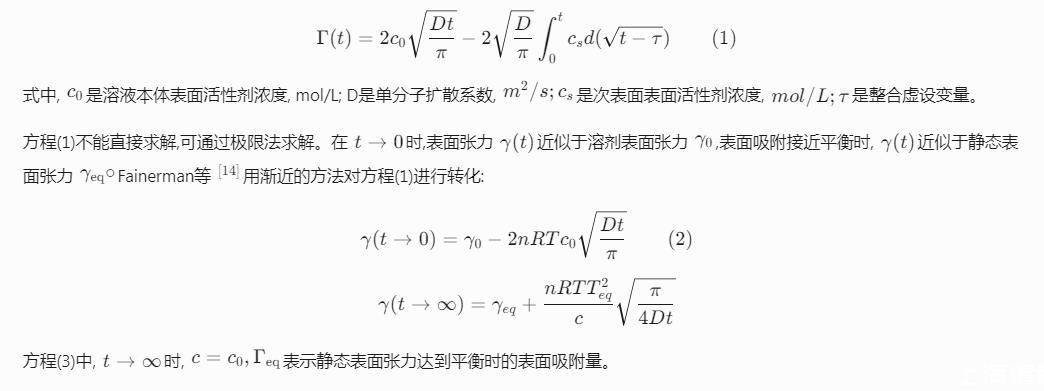 表面活性劑是一種能夠在界面吸附,降低界面張力的物質(zhì)。在界面快速形成過程中,如紡織品、紙和其他基質(zhì)的快速潤濕,液體的發(fā)泡,用靜態(tài)(平衡)表面張力不能全面表征表面活性劑快速降低界面張力的能力,而動態(tài)表面張力能更好地表征表面活性劑在上述過程中所起的作用。1946年Word和Tordai研究陰離子表面活性劑的界面吸附行為,提出了描述氣/液界面吸附量隨吸附時間變化的Word-Tordai方程;隨著各種檢測手段的開發(fā)應(yīng)用,20世紀(jì)90年代起,關(guān)于表面活性劑的動態(tài)表面張力及其在氣/液界面吸附行為又引起該領(lǐng)域研究者的關(guān)注。Eastoe和Dalton通過研究雙子型非離子表面活性劑在空氣——水界面的吸附機(jī)理,驗證了Word和Tordai提出的擴(kuò)散控制吸附和混合動力控制吸附模型適用于該體系。柴金玲等利用Word-Tordai方程得到烷基聚葡糖苷(APG)在不同濃度、溫度時的擴(kuò)散系數(shù)和表觀擴(kuò)散系數(shù),并發(fā)現(xiàn)鹽對吸附行為有明顯影響;劉杰等通過Rosen模型研究膠束對APG的動態(tài)表面張力的影響,發(fā)現(xiàn)各項參數(shù)的變化趨勢不會因為膠束的形成而受到影響。