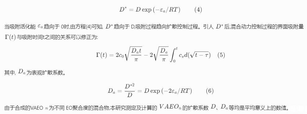 擴(kuò)散控制的吸附過程,表面活性劑分子由濃度差驅(qū)使進(jìn)入新表面,不存在吸附勢壘。Word-Tordai方程描述了界面吸附量Г(t)與吸附時間t的關(guān)系:Г(t)=2c0Dtπ-2Dπ∫t0csd(t-τ)(1)式中,c0是溶液本體表面活性劑濃度,mol/L,D是單分子擴(kuò)散系數(shù),m2/s,cs是次表面表面活性劑濃度,mol/L,τ是整合虛設(shè)變量。方程(1)不能直接求解,可通過極限法求解。在t→0時,表面張力γ(t)近似于溶劑表面張力γ0,表面吸附接近平衡時,γ(t)近似于靜態(tài)表面張力γeq.Fainerman等用漸近的方法對方程(1)進(jìn)行轉(zhuǎn)化:γ(t→0)=γ0-2nRTc0Dtπ(2)γ(t→∞)=γeq+nRTГ2eqcπ4Dt(3)方程(3)中,t→∞時,c=c0,Γeq表示靜態(tài)表面張力達(dá)到平衡時的表面吸附量。混合動力擴(kuò)散吸附是指表面活性劑分子從本體擴(kuò)散到次表面仍然遵循擴(kuò)散機(jī)理,但從次表面層擴(kuò)散到表面層時需克服一定的勢壘。Liggieri和Ravera[15,16]提出,次表面層中的分子,只有能量大于吸附活化能εa才能被吸附到表面,已吸附的分子,只有能量大于解吸活化能εb才能被解吸。以Word-Tordai方程為基礎(chǔ),引入矯正擴(kuò)散系數(shù)D?。矯正擴(kuò)散系數(shù)D?和擴(kuò)散系數(shù)D關(guān)系定義為:D?=Dexp(——εa/RT)(4)當(dāng)吸附活化能εa趨向于0時,由方程(4)可知,D?趨向于D,吸附過程趨向擴(kuò)散控制過程。引入D?后,混合動力控制過程的界面吸附量Г(t)與吸附時間t之間的關(guān)系可以修正為:Г(t)=2c0Datπ-2Daπ∫t0csd(t-τ)(5)其中,Da為表觀擴(kuò)散系數(shù)。Da=D?2D=Dexp(——2εa/RT)(6)由于合成的VAEOn為不同EO聚合度的混合物,本研究測定及計算的VAEOn的擴(kuò)散系數(shù)D、Da等均是平均意義上的數(shù)值。