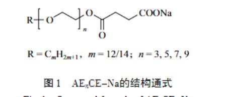 表面活性劑是一類應用廣泛的有機化合物,極少的用量就能顯著提高溶液的性能,因此,表面活性劑的研究具有重要的現實和理論意義。其中,陰離子和非離子型表面活性劑的用量最多且應用最為廣泛,它們具有優異的去污性、水溶性、耐熱性、耐鹽性及制備成本低和環境友好等優點。然而,傳統的表面活性劑分子通常只包含一個親水頭基和一個疏水尾鏈,很難同時具有陰離子和非離子表面活性劑的特性。值得一提的是,脂肪醇醚琥珀酸酯鹽(AEnCE-Na,n=3,5,7,9)是一種新型的表面活性劑,結構通式如圖1所示。結構決定性質,因此,可以推斷AEnCE-Na具有許多優異的性能:1)一個分子中同時存在兩個親水基團(EO鏈和陰離子頭基)和一個疏水基團(烷基碳鏈),使其具有優異的表面活性、乳化性和發泡性;2)分子中的酯基在水解后可形成具有優異生物降解性的非離子表面活性劑和鹽,因此,該類表面活性劑安全且環保,符合當代“綠色化”的發展理念;3)直鏈表面活性劑比支鏈表面活性劑具有更好的自降解能力。然而,目前對于脂肪醇醚琥珀酸酯鹽表面活性劑的研究甚少。