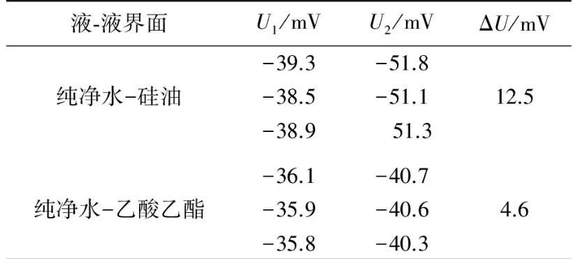 實驗測量所用金屬吊環的外徑、內徑分別為0.034 96 m和0.033 10 m.在20℃實驗條件下,采用自制2種液體間界面張力的動態實時測量儀,測量了純凈水-硅油和純凈水-乙酸乙酯間的界面張力.測量出金屬吊環由液體I中完全進入液體Ⅱ的過程中,液體I的液膜被拉斷前電壓的最大值U1,拉斷后趨于穩定時的電壓值為U2,數據結果如表1所示.