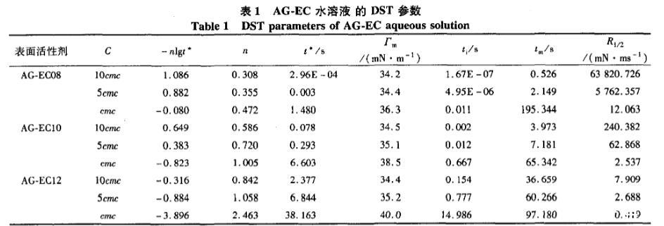 在25cc下測定不同濃度AG.EC水溶液的DST,并利用Rosen模型處理,得到其動態(tài)表面張力參數(shù),見圖4、表1。