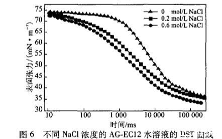 平衡張力研究表明,三種烷基糖苷檸檬酸單酯鹽在其各自的水溶液中均具有表面活性。動態(tài)表面張力研究表明,同摩爾濃度AG—EC08、AG.ECIO和AG—EC12水溶液的動態(tài)表面活性在達(dá)到一定時間后隨表面活性劑分子的疏水鏈增長而不斷增大;AG—EC溶液的濃度越高,其動態(tài)表面活性越好,DST越快平衡,DST曲線越低。而當(dāng)溫度升高,其DST明顯下降;無機(jī)電解質(zhì)NaC1對其DST的影響也較明顯,隨著NaC1濃度增大,其DST曲線越低。