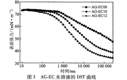由圖3可知,對于不同鏈長的AG.EC水溶液,其DST曲線都是微微下降一快速下降一緩慢平衡的過程。另外在疏水鏈變長的同時,DST曲線的誘導(dǎo)期時間縮短,DST下降趨勢增加,介平衡狀態(tài)表面張力值越低。這是由于疏水烷基鏈增長使得表面活性劑的疏水性增強(qiáng),更容易吸附到溶液的表面。
