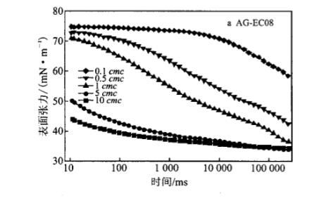 2.2.1烷基糖苷檸檬酸單酯二鈉鹽的烷基鏈長對其水溶液動態(tài)表面張力的影響圖3為不同烷基鏈長的AG-EC水溶液(2.26mmoL/L)的DST隨時間變化的情況。