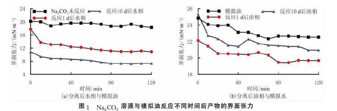 在Na2CO3溶液與模擬油反應(yīng)1d和10d后,分離得到的水相及油相分別與模擬油及模擬水間的界面張力隨測(cè)定時(shí)間關(guān)系見圖1.由圖1(a)可以看出,Na2CO3溶液和模擬油反應(yīng)1d及10d后分離出的水相與模擬油的界面張力,比未反應(yīng)Na2CO3溶液與模擬油的界面張力低,且隨著反應(yīng)時(shí)間增加,水相與模擬油的界面張力降低。這說明模擬油中酸性物質(zhì)與Na2CO3溶液反應(yīng)生成的部分界面活性物質(zhì)具有較好的水溶性。水溶性的界面活性物質(zhì)在油水界面處吸附,使分離出的水相與模擬油界面張力降低;隨著反應(yīng)時(shí)間的增加,所生成的界面活性物質(zhì)增多,分離出的水相與模擬油的界面張力降低幅度增大。