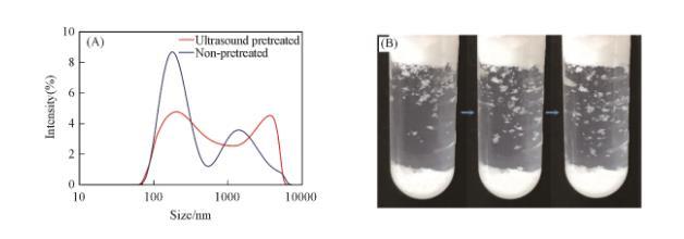 值得注意的是,如果粒子首先用超聲波分散在液體中,然后以相同的方式振蕩,則顆粒產(chǎn)生的泡沫高度有所下降[圖6(A)]。因此對(duì)比了振蕩和超聲波處理后的顆粒在液體中團(tuán)聚體的粒徑大小。采用動(dòng)態(tài)光散射儀間接表征了顆粒在液體中的團(tuán)聚情況[圖7(A)]。可以看出,振蕩后的液體中有較多物質(zhì)的粒徑大于單個(gè)顆粒直徑,而且粒徑分布很寬。這證明液體中存在明顯的顆粒團(tuán)聚體。由于顆粒本身存在巨大的表面能,多數(shù)顆粒在空氣中已經(jīng)自發(fā)團(tuán)聚。顆粒在液體中大多也以團(tuán)聚體的方式存在。少量空氣被密封在浸沒于油相中的顆粒團(tuán)聚體內(nèi)部,這部分不與外界聯(lián)通的空氣提供了額外的壓力,進(jìn)而阻止了進(jìn)一步滲透。這種顆粒團(tuán)聚體表面同樣形成了由Cassie-Baxter方程描述的復(fù)合表面,該復(fù)合表面的形成保護(hù)了構(gòu)成團(tuán)聚體的顆粒不被完全潤濕,并使團(tuán)聚體表面具有合理的疏油性(cosθ_CB的值接近0),從而在熱力學(xué)上團(tuán)聚體便于發(fā)生吸附。而溶液經(jīng)超聲波處理后顆粒被潤濕,團(tuán)聚體被破壞使尺寸變小,并且均勻分布在溶液中。圖6(B)顯示了在經(jīng)超聲波處理后的表面張力測(cè)試數(shù)據(jù),同樣表明團(tuán)聚體被破壞后,被潤濕的顆粒不再傾向于吸附在表面上。