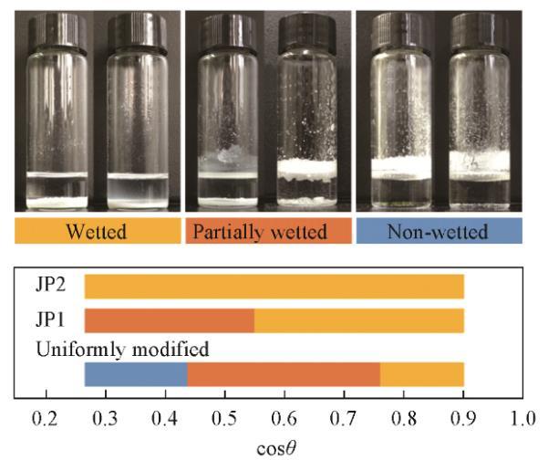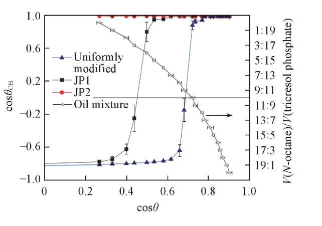 放置在靜止液體表面的顆粒的潤濕行為由圖5示出。隨著液體表面張力的增加,從光滑的氟碳鏈覆蓋的表面獲得的cosθ值同時(shí)增大,液體頂部的表面出現(xiàn)明顯的不溶顆粒。這種顆粒不潤濕的情況與顆粒形成粗糙表面測(cè)量的結(jié)果具有相關(guān)性。干燥的顆粒以蓬松狀態(tài)直接向油相傾倒,如果在油相表面能形成足夠強(qiáng)壯的、由顆粒組成的亞穩(wěn)態(tài)Cassie-Baxter狀態(tài),那么疏油表面將會(huì)形成,并阻止其它顆粒接觸油相,宏觀表現(xiàn)為顆粒不潤濕。相反,如果油相表面由顆粒組成的亞穩(wěn)態(tài)Cassie-Baxter狀態(tài)魯棒性不足,在手動(dòng)振蕩或重力作用下,顆粒或顆粒團(tuán)聚體接觸油相并浸沒在油相中。亞穩(wěn)態(tài)魯棒性與顆粒表面材料潤濕角密切相關(guān),即不同類型的顆粒具有明顯不同的潤濕轉(zhuǎn)折點(diǎn)。JP1潤濕性轉(zhuǎn)折點(diǎn)位于均勻修飾顆粒右側(cè),JP2沒有發(fā)現(xiàn)潤濕轉(zhuǎn)折點(diǎn)。這與顆粒上接枝的烷烴鏈數(shù)量有關(guān)。JP2上盡管存在氟碳鏈,但由于烷烴鏈覆蓋的面積太大,使顆粒整體表現(xiàn)出強(qiáng)烈的親油性。