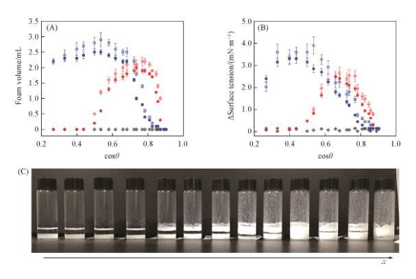 然而,顆粒在超聲波的作用下依舊產(chǎn)生了泡沫。這是由于顆粒數(shù)量多,顆粒團(tuán)聚體尺寸變得十分巨大,并出現(xiàn)明顯沉淀。超聲波無法把這些團(tuán)聚體完全破壞。受超聲波作用,團(tuán)聚體被分散成更小的狀態(tài),但依舊有十分明顯的沉淀。在用手劇烈振蕩之后,無論顆粒是否被超聲波處理過,均有機(jī)會(huì)重新形成更大的、肉眼可見的團(tuán)聚體[圖7(B)],這說明顆粒團(tuán)聚體是產(chǎn)生泡沫的關(guān)鍵。結(jié)合圖4和圖6結(jié)果,以粗糙表面代表的顆粒團(tuán)聚體表面接觸角在θ_CB為90°(cosθ_CB=0)附近具有最多的泡沫體積和最大的表面張力降低值,而對(duì)應(yīng)的θ均小于70.1°(cosθ > 0.39),這表明顆粒在油氣表面上吸附并起泡需要顆粒團(tuán)聚體的Cassie-Baxter復(fù)合表面的接觸角θ_CB約為90°,而對(duì)應(yīng)的顆粒的本征接觸角θ則小于70.1°,不需要單個(gè)顆粒潤濕角必須接近90°。
