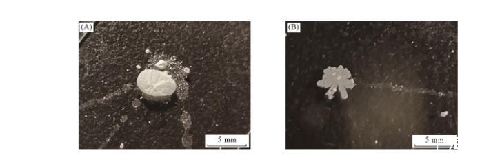 在顆粒參與形成“泡沫”過程中,存在另外一種現(xiàn)象(見圖8)。在磷酸三甲酚酯溶液中,顆粒附著在液氣表面上,有可能形成氣相為連續(xù)相、液相為非連續(xù)相的狀態(tài)[圖8(A)]。在無外力作用下,該液滴能夠保持長時(shí)間穩(wěn)定。如果推動(dòng)液滴,顆粒從氣液表面脫落[圖8(B)],則液滴破碎,留下一層顆粒組成的薄膜。