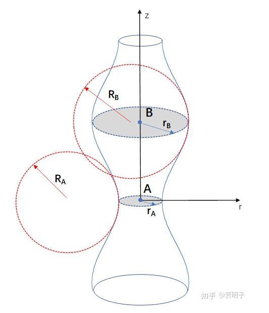 我們可以看到,在不同的地方,柱面的曲率都發生了變化,這種變化和表面張力一起,就導致了水柱當中不同地方內部壓力的變化。那么,我們如何判斷這種影響呢?我們說,如果A點(柱半徑縮小的地方)的壓力上升,B點壓力下降,那么: