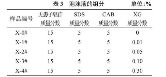表3為泡沫溶液的配方。根據三元復配體系的發泡性能,選取發泡性能最佳的9號組,無患子皂苷、SDS、CAB質量分數固定在15%、5%、5%。研究XG濃度變化對泡沫溶液性能的影響。