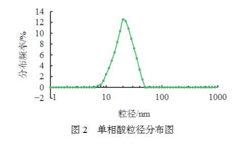 采用激光粒度分析儀對單相酸粒徑及分布進行了測定,實驗結果見圖2。可知單相酸粒徑大小分布在7~50 nm范圍之內,分布較窄,為高斯分布,在單相微乳粒徑范圍內。